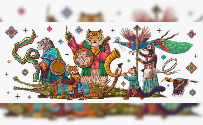 ‘डूडल’मध्ये लडाख प्रदेशातील पारंपारिक पोशाख घातलेला आणि हातात रिबन धरून दोन पायांवर चालणारा हिम बिबट्या दाखवण्यात आला आहे. त्याच्या शेजारी एक वाघ दोन पायांवर उभा असलेला आणि वाद्य धरलेला दिसतो. एक मोर उडत आहे आणि पारंपारिक पोशाखात एक हरिण हातात औपचारिक काठी घेऊन चालत आहे.