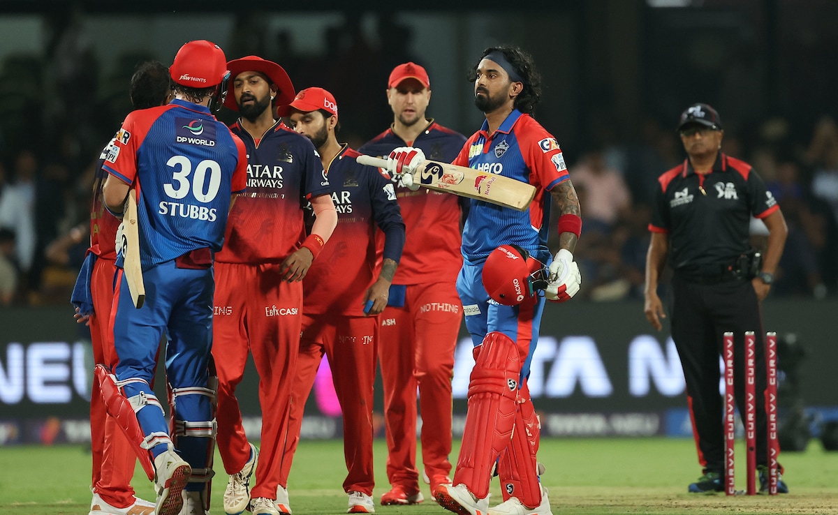 दिल्ली राजधानी म्हणून के.एल. राहुलच्या ul ul ul n नाबाद def unted मध्ये स्पिनर्सच्या कुलदीप यादव आणि विप्राज निगम यांच्या कारकिर्दीने गुरुवारी बंगळुरूमध्ये रॉयल चॅलेंजर्स बेंगलुरूवर सहा विकेटच्या विकेटचा विजय मिळविला. एकदा रॉयल चॅलेंजर्सना सात बाद 163 पर्यंत मर्यादित राहिले की राजधानींना फक्त सामान्य ज्ञानाने फलंदाजी करणे आवश्यक होते परंतु निपाटवरील त्यांच्या फ्रंटलाइन फलंदाजांमध्ये ही एक दुर्मिळ वस्तू होती. पण सामन्यातील खेळाडू केएल राहुलने सात चौकार आणि सहा षटकारांसह balls 53 चेंडूंवर विजय मिळविला, त्याने चौथ्या विकेटसाठी १११ धावा केल्या आणि तितकाच पातळीवरील ट्रिस्टन स्टब्ब्स (not 38 बाद झाला) बाउन्सवर चौथा विजय मिळविला. डीसीने चार स्पर्धेत 169 केले.