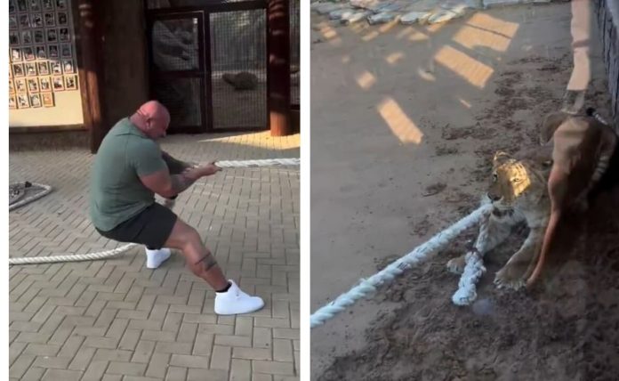 सध्या सोशल मीडियावर एक धक्कादायक व्हिडीओ समोर येत आहे, ज्यामध्ये पिंजऱ्यात कैद झालेली एक भयंकर सिंहीण माणसांसोबत युद्ध करताना दिसत आहे. व्हिडिओमध्ये, एक सिंहीण आपल्या जबरदस्त ताकदीने एका बॉडीबिल्डरला कशी पराभूत करत आहे आणि एका अद्भुत ‘टग ऑफ वॉर’ स्पर्धेला जन्म देत आहे. इंटरनेटवर व्हायरल होत असलेल्या या व्हिडीओमध्ये एक मांसल माणूस जाड दोरी ओढताना दिसतो, पण तो दोरी ज्या दिशेला ओढत आहे त्या दिशेने तो एका न पाहिलेल्या व्यक्तीला भेटतो. तो माणूस सतत खेचण्याचा प्रयत्न करतो, पण त्याचा विरोधक (जो व्हिडिओमध्ये दिसत नाही) त्याला खेचत राहतो, त्यामुळे त्या माणसाची अवस्था बिकट होते. घामाने भिजलेला माणूस दोरी ओढतो, पण त्याची ताकद पुरेशी नसते आणि त्याची पावले मागे खेचू लागतात.