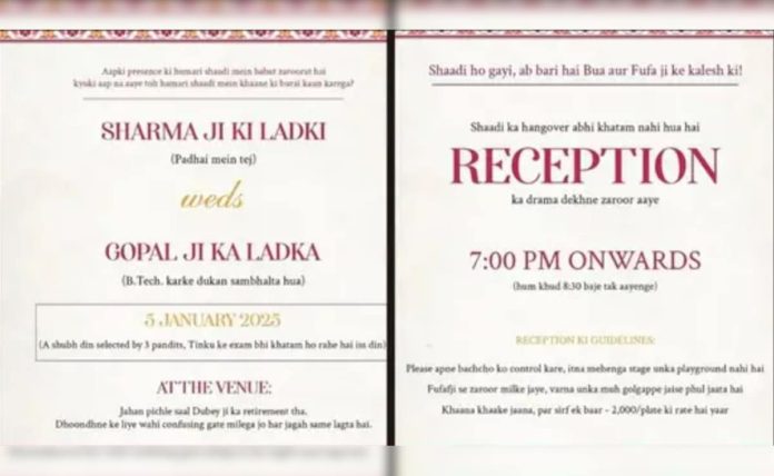 कार्डमध्ये वधूची ओळख करून देताना ‘अभ्यासात हुशार’ असे लिहिले आहे. ‘बी-टेक केल्यानंतर दुकान सांभाळतो’, असे मुलाच्या कौतुकात लिहिले आहे. यासोबत लग्नाच्या ठिकाणाचा पत्ता असा लिहिला आहे की, तुम्ही कल्पनाही करू शकत नाही.. ‘गेल्या वर्षी दुबेजींची निवृत्ती कुठे झाली होती,’ असे लिहिले आहे. शोधण्यासाठी, आपल्याला समान गोंधळात टाकणारे गेट सापडेल जे सर्वत्र सारखेच दिसते. 25 जानेवारीला होणाऱ्या या लग्नाच्या कार्डमध्ये खाली लिहिले आहे.. ‘तीन पंडितांनी हा दिवस ठरवला आहे, टिंकूच्या परीक्षाही या दिवशी संपत आहेत.’ रिसेप्शनची माहिती देताना ‘लग्न संपले, आता काकू-काकांच्या त्रासाची पाळी आहे’ असे लिहिले आहे.