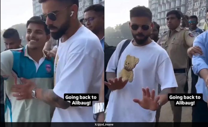 सोशल मीडियावर समोर आलेल्या एका व्हिडिओमध्ये विराट चाहत्यांना “भाई मेरा रास्ता मत रोको मेरा (भाईंनो, माझा मार्ग अडवू नका)” असे म्हणताना ऐकू येत आहे. व्हिडिओमध्ये, कोहली अलिबागला जाताना फेरी पकडण्याचा प्रयत्न करत असताना पंख्याला थोडेसे बाजूला ढकलून मार्ग काढताना दिसत होता.